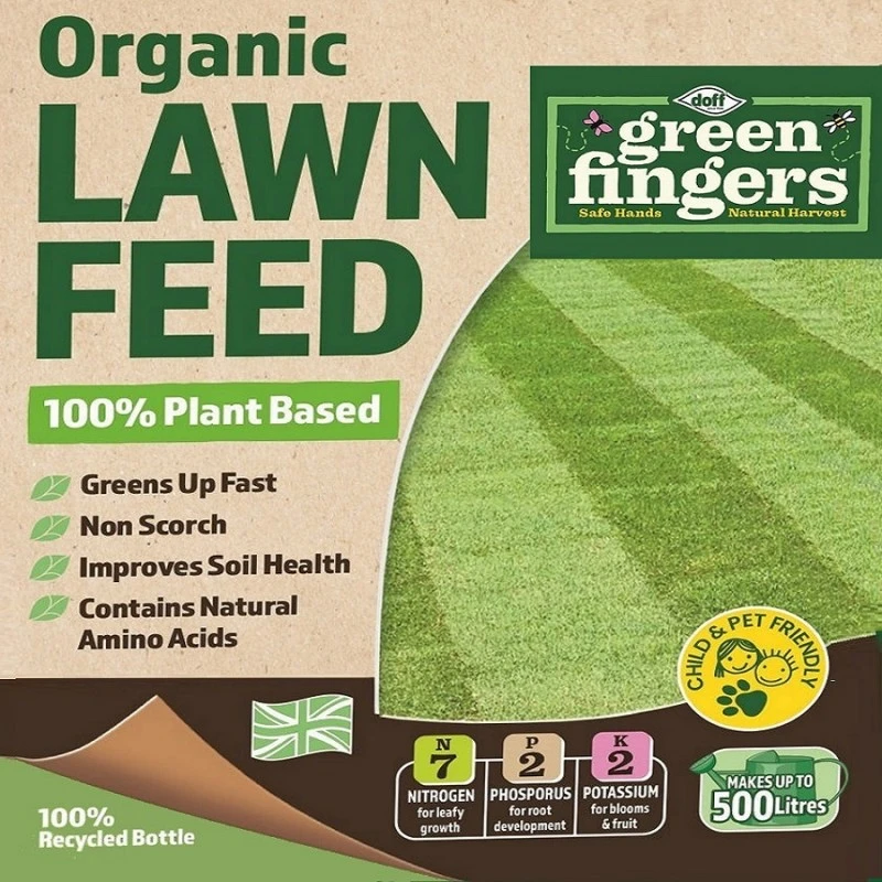 Doff Green Fingers Lawn Feed is a top quality liquid lawn feed a Molasses based liquid feed that greens up the lawn fast and contains Nitrogen, Phosphorus, Potassium and Iron all the essential elements for good grass growth root and soild development.