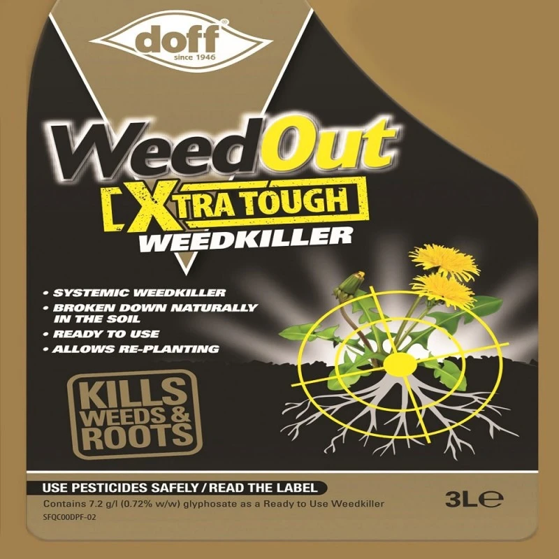 Doff 3 litre Weedout Extra Tough Weedkiller Concentrate contains glyphosate ready to use.
