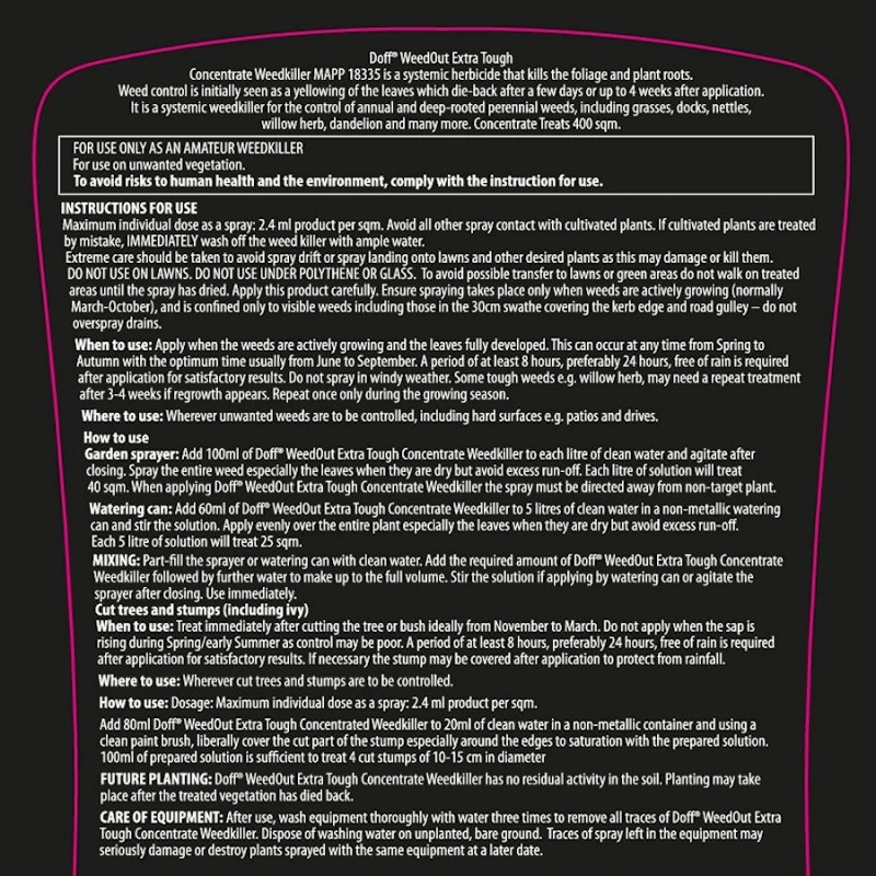 Doff Weedout Extra Tough Weedkiller Concentrate MAPP 18335 contains 90g/l glyphosate in a soluble concentrate.