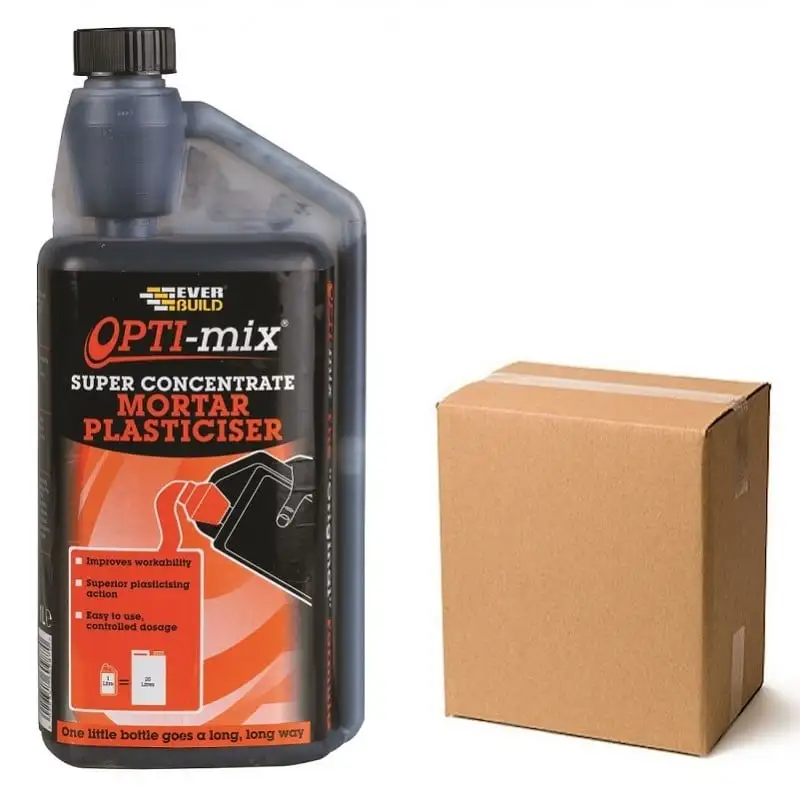 Trade Option Box of 12 Optimix1 highly concentrated air entraining liquid plasticising admixture that’s 25 times the strength of conventional products. Forms extremely stable air bubbles in mortar cement mix improving the workability of mortar, giving it a buttery consistency that gives the best finish and usability. Helps prevent shrinkage, cracking, crazing, mild frost damage during the curing process, as well as providing long term resistance to freeze thaw cycles. Opti Mix mortar Plasticiser replaces lime in the mix and reduces the chance of efflorescence. Soothes out variations between separate batches of sand & cement mix