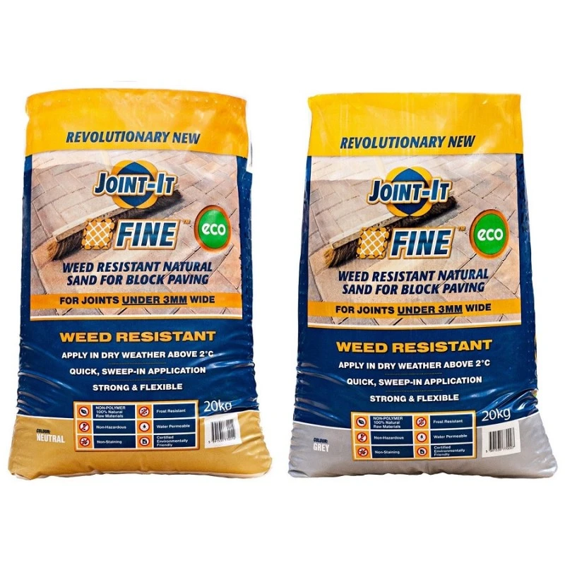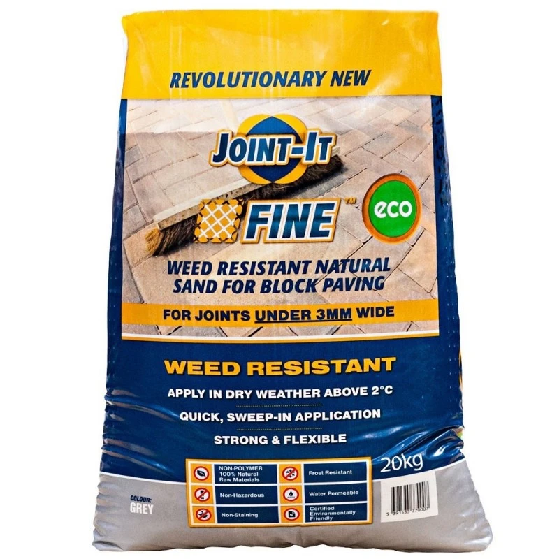 Joint it Fine Setting Sand is a moisture curing sand jointing material for narrow block paving joints for joints that are 3mm wide or smaller. Joint It Fine is faster than traditional methods. Watch the video for complete instructions. The active sand is swept into the joints before being saturated with water giving perfect pointing, and can be used for all types of block paving.