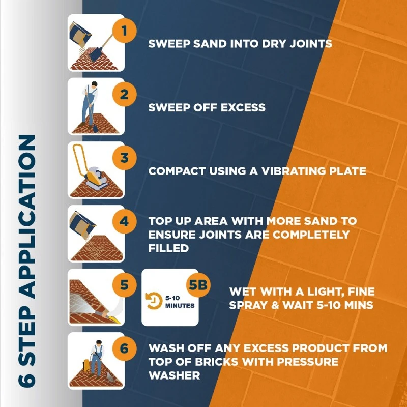 When applying, the best results are obtained using a Wacker plate to vibrate the sand to the bottom of the joints. These can be hired relatively cheaply at most tool hire shops and are usually delivered to your door.
