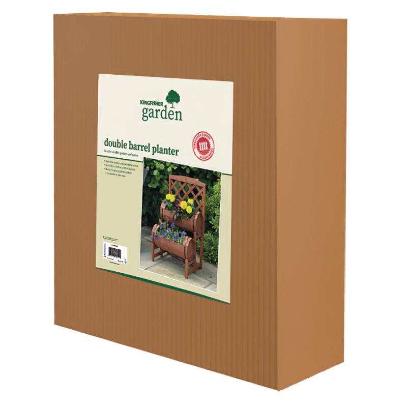 Kingfisher Garden Wood Twin Barrel Flower Planter with a trellis wooden trellis backing.