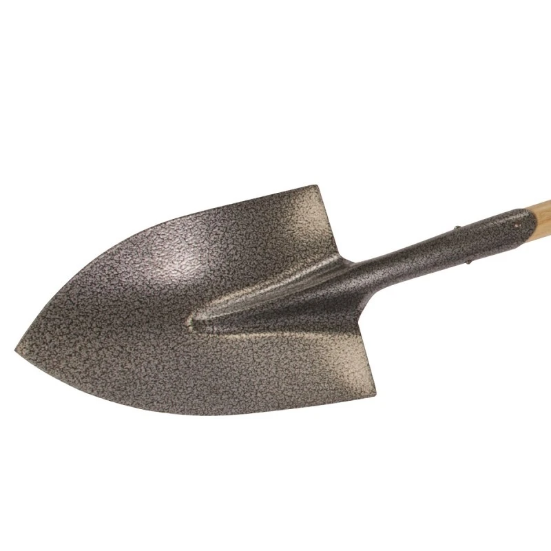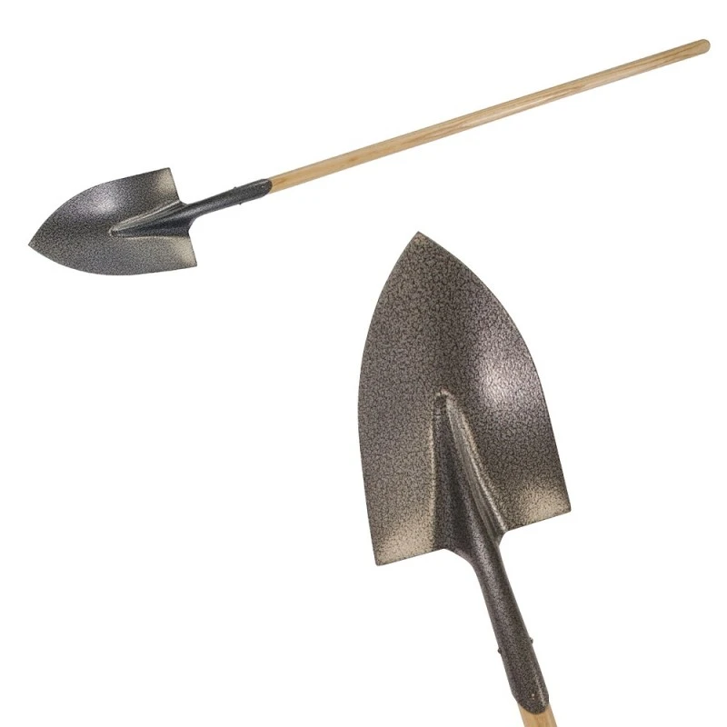 This long handled shovel features a v shaped head and pointed blade for improved penetration.