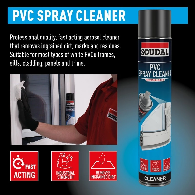 Soudal PVC Spray cleaner is a professional industrial cleaner designed for deep cleaning of plastic frames and othe plastics including garden furniture.